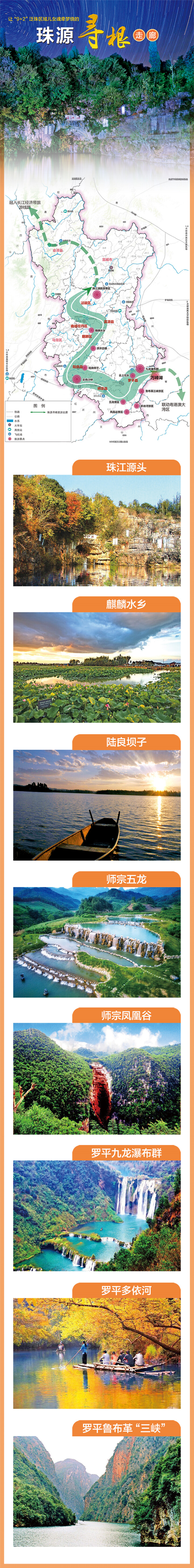 徐霞客盛赞曲靖沾益马雄山“一水滴三江,一脉隔两盘”。1985年,珠江水利委员会正式确定马雄山为珠江正源。在广袤的珠源大地上,麒麟水乡秀美如画,五龙壮乡旖旎多彩,凤凰谷深藏生命奥秘,九龙瀑布雄浑豪迈,多依河温婉多情,鲁布革小三峡湖光山色;回龙谷壮丽险峻,雨碌大地缝幽深奇绝,大海草山夏草冬雪,尼珠河大峡谷极致落差,彩色沙林五彩斑斓,南丹山一石成山,那色峰海峰林绵延。依托这条走廊,打造饮水思源、情满珠江的地缘文化纽带,让开放发展之路越走越宽。