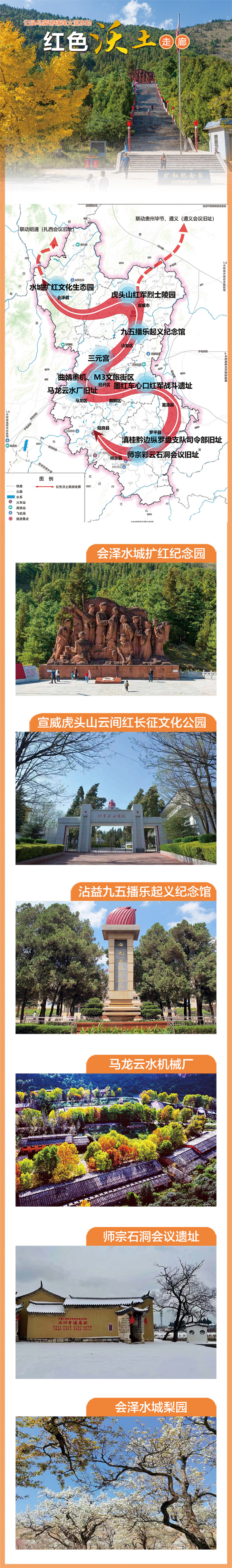 1927年,曲靖第一个党组织在会泽成立。红军长征两入曲靖,三元宫会议、水城扩红、虎头山战役等彪炳史册。解放战争时期,开辟钟山、龙海山、播乐等革命根据地。“三线建设”留下了“艰苦奋斗、奋发图强”的精神财富与工业遗存。依托这条走廊引领人们追寻革命足迹,让红色基因代代相传。