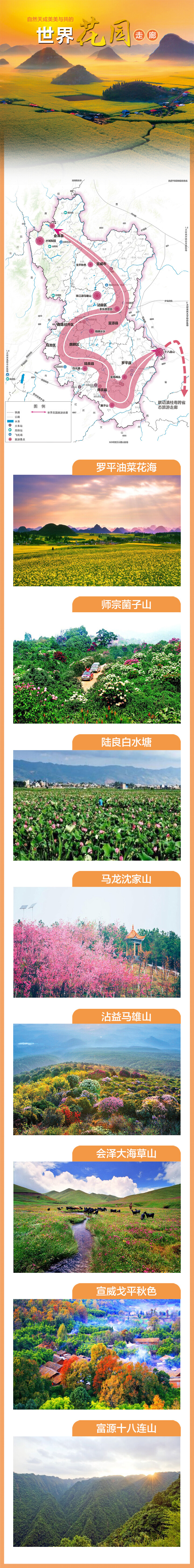受昆明准静止锋气候和北高南低、西高东低高原地形地貌影响,曲靖冬无严寒、夏无酷暑,一年四季花事不断。春季,金鸡峰丛的油菜花海拉开世界最美春天序幕,菌子山万亩高山杜鹃盛放,沈家山樱花粉黛漫谷,水城梨园花开如雪。夏季,麒麟水乡、白水塘莲叶田田、荷花映日。秋季,土瓜冲绣球花、升官屯玫瑰花海游人如织。冬季,梅花、北美冬青、冬樱花绽放在城市角落。依托这条内联省区、外联境外的绿色生态走廊,让曲靖的花香引力持续转化为发展动力。