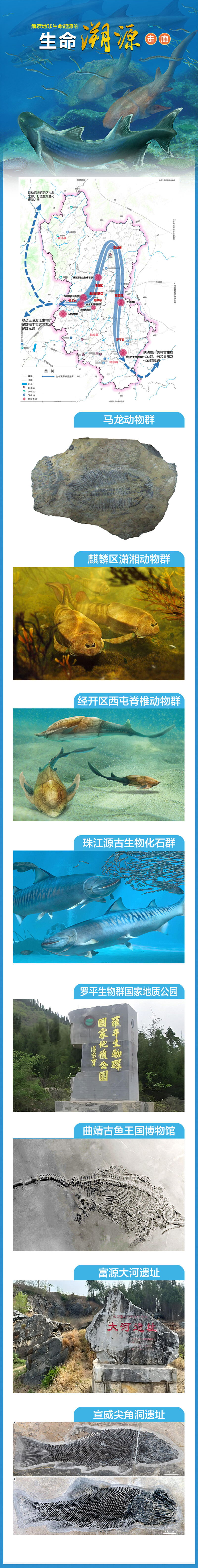 曲靖保存有大量鱼类化石,填补了“从鱼到人”早期演化树的“缺失环节”。是约4.1亿年前登陆鱼类和人类鱼形祖先的发源地,是世界古生物学和发育生物学研究胜地。4万至10万年前的富源大河遗址,证明中国南方是现代人类起源与多地区连续进化的关键地之一。依托这条走廊,打造具有国际影响力的古生物自然科普与研学品牌,让尊重科学、崇尚科学成为曲靖的鲜明标识。