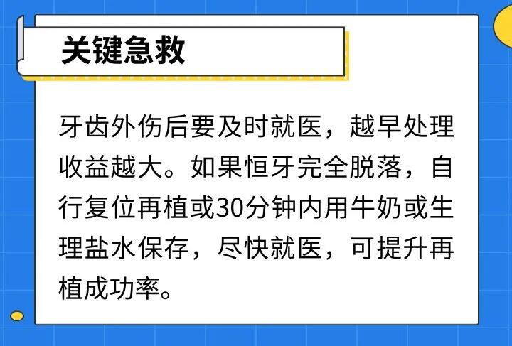 3.牙外伤。打球、摔倒等意外撞击是主要诱因,上前牙前突的孩子风险更高。轻者牙齿松动、敏感,重者牙齿折断、移位甚至完全脱落;延误治疗会导致牙髓坏死、牙根吸收。乳牙外伤还可能影响下方恒牙胚发育。