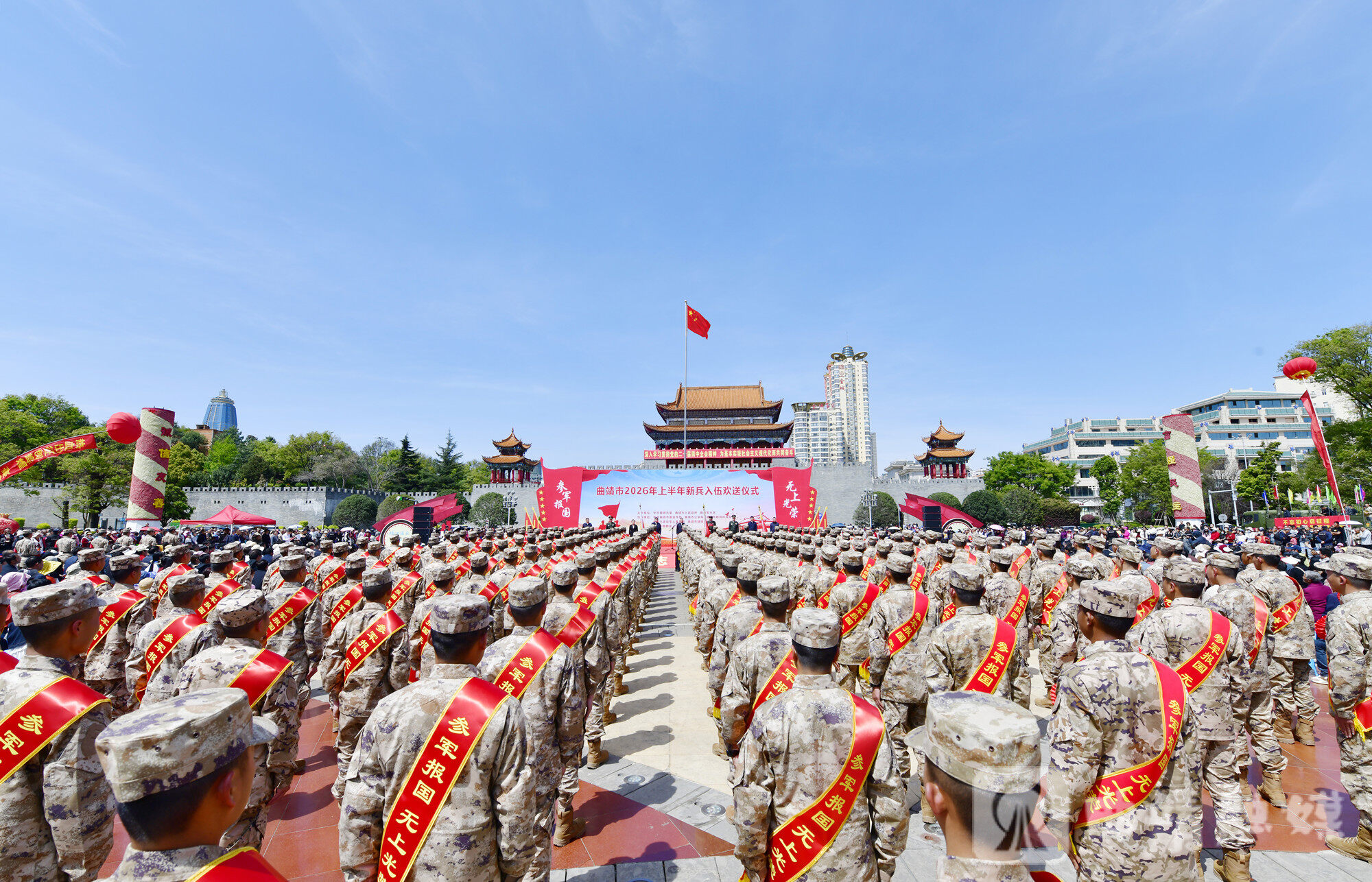 新兵欢送仪式在雄壮的国歌声中拉开帷幕。南城门广场上,新兵战士整齐列队,他们英姿挺拔、整装待发,满怀着豪情壮志,激荡着青春力量。