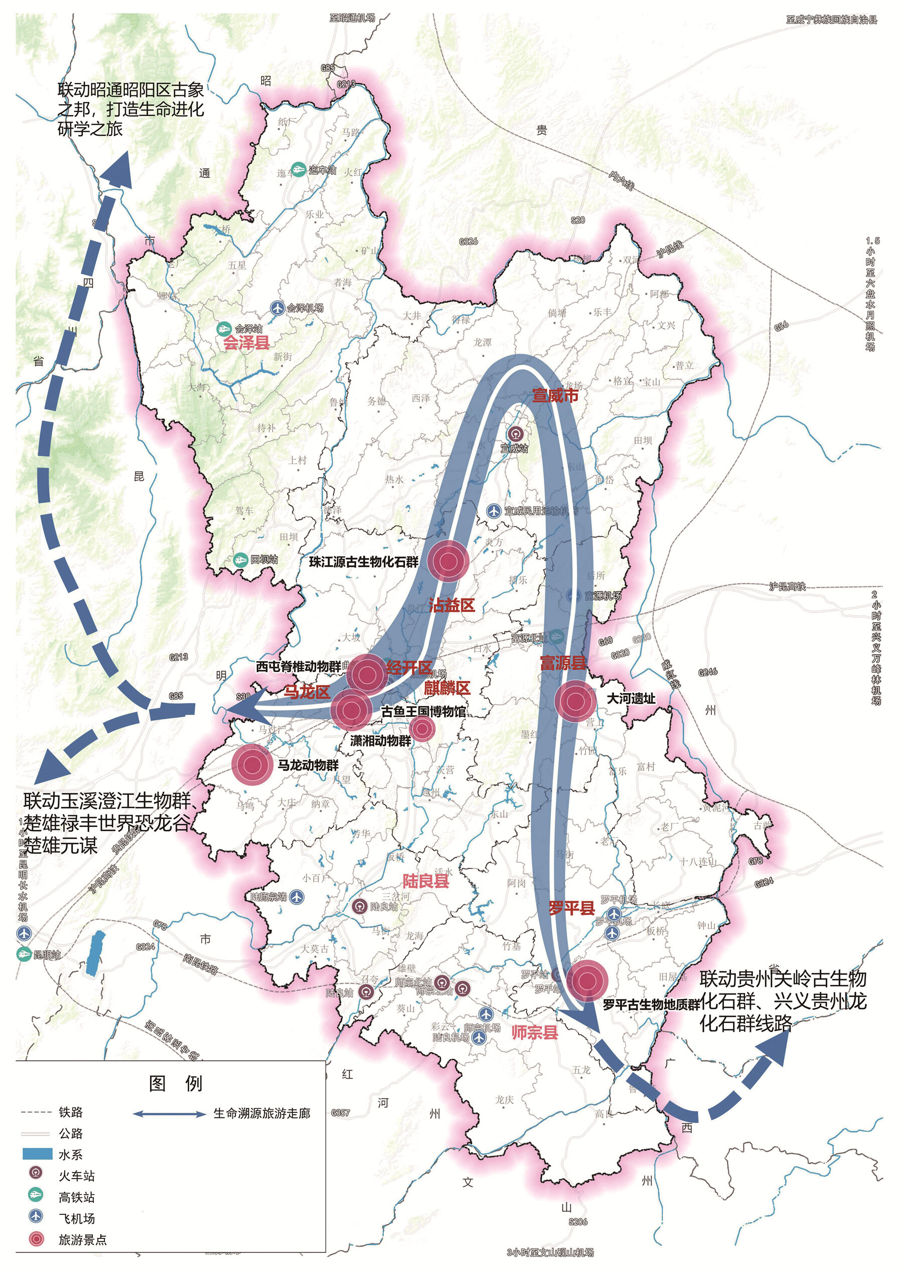 曲靖以走廊为纽带,深耕产品创新,全力让沉睡亿年的化石“活起来”。依托10个重点项目,精心开发4个博物馆科普展览、3个“文创+”系列产品、2个“AI+”沉浸式体验产品,同步升级焕新1个重点景区沿线研学产品基础配套;古鱼王国博物院引入AR、VR技术,让参观者沉浸式体验远古海洋;罗平地质公园打造科普基地,普及生命复苏知识;大河遗址加强保护研究,重现远古人类生活场景。