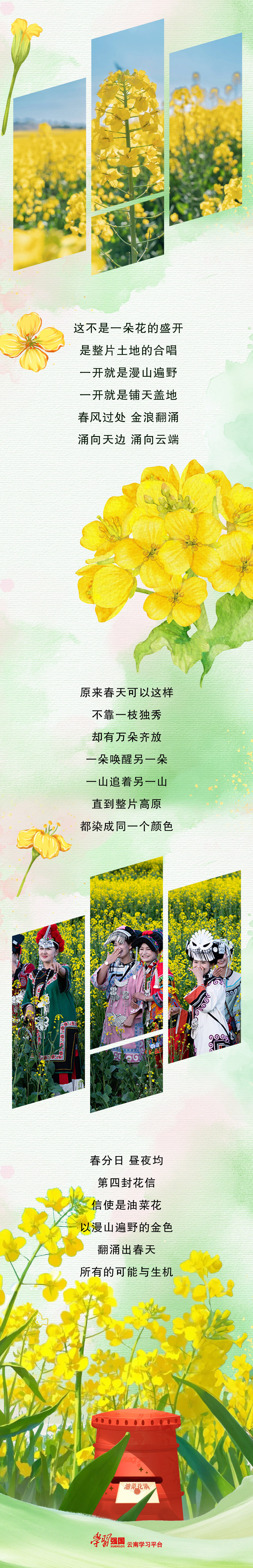 【编者按】二十四节气,是大地说给时间的细语。在云南,这些细语绽放成花,有了颜色与形状。“学习强国”云南学习平台推出“写给云南的二十四封花信”系列策划,以长图为信笺,以云花为信使,给云南写二十四封信。在绽放与凋零之间,触碰这片土地的温柔与浪漫。愿你在此,读一花一世界,见一季一山川。今日是第四封信——春分·油菜花满。