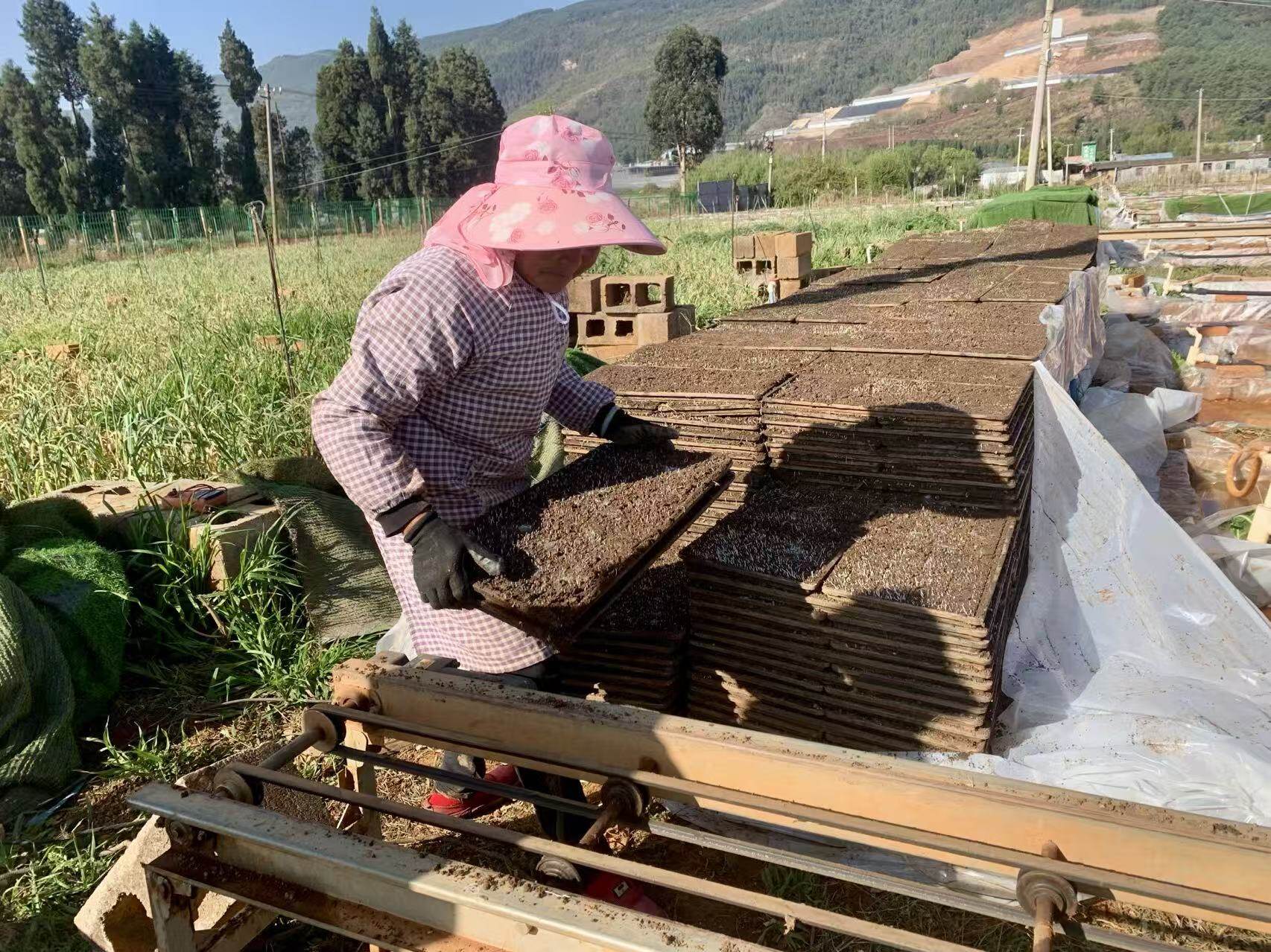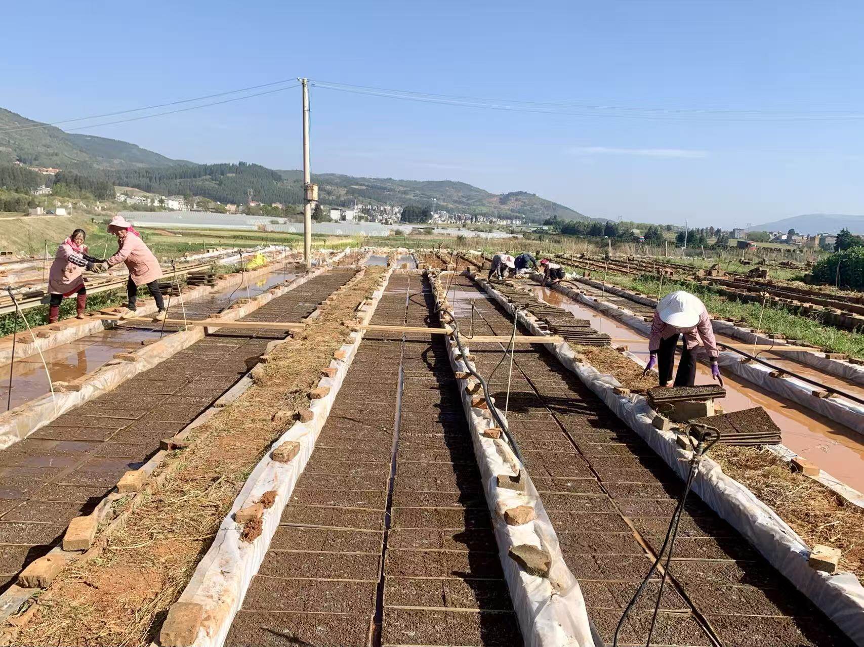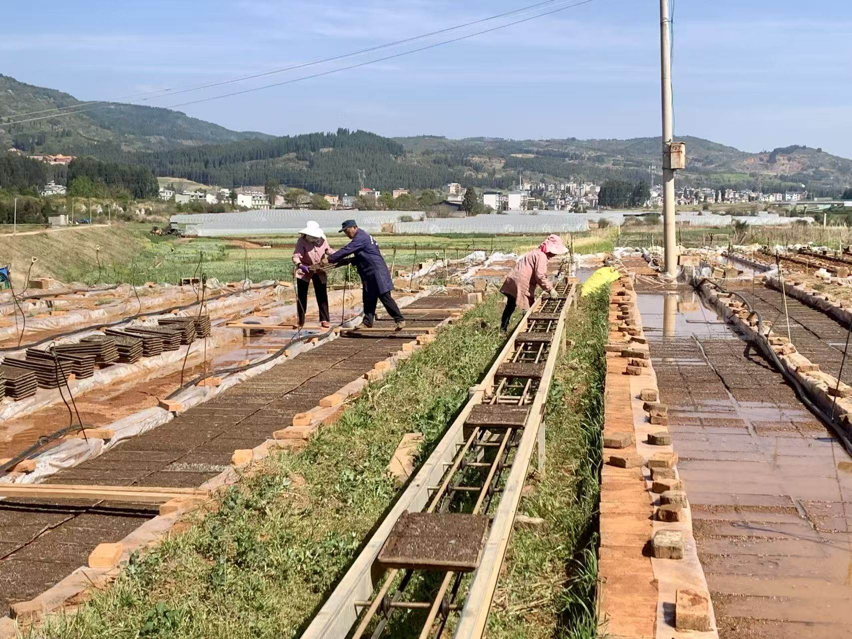 时下,麒麟区水稻机械化育秧工作已全面铺开、有序推进。在越州镇横大路村育秧基地,农户们将一盘盘完成暗化、催芽的水稻育苗盘整齐码放在传送带上,送入育苗池,顺利进入覆膜育苗阶段。