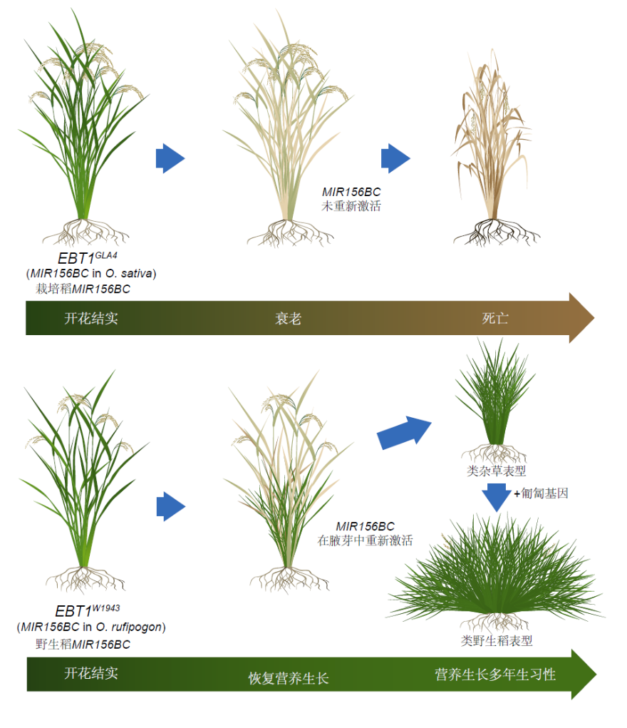 MIR156BC的重置介导了水稻从一年生向多年生的转变示意图。(中国科学院分子植物科学卓越创新中心供图)