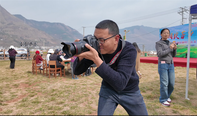 人群中,一个手持相机的身影格外活跃,他正在用镜头捕捉下一张张明媚的笑脸。他,就是会泽县娜姑镇社会事务办主任、白雾村乡土文化能人何健。