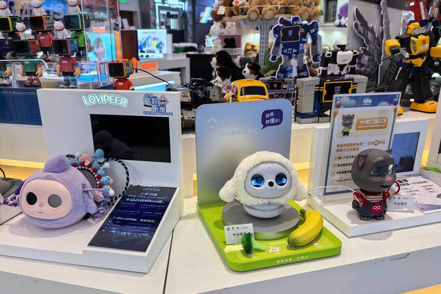 在上海市某商场的AI玩具专区前,家长吴先生正仔细比对着几个玩具的区别。