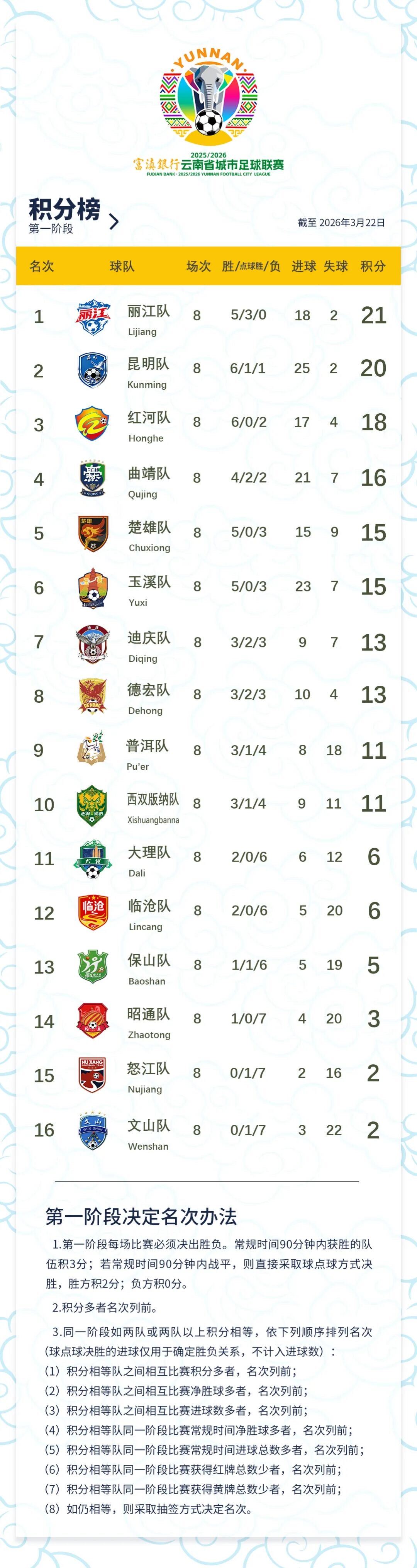 云南网讯(记者 贺凯)3月22日,2025/2026富滇银行云南省城市足球联赛第八轮战罢,最新积分榜正式出炉。丽江队凭借持续强势表现,以不败战绩稳居积分榜首位,展现出强劲的竞技状态和稳定的发挥。紧随其后的昆明队同样表现抢眼,一路高歌猛进斩获七连胜,目前与丽江队仅有一分之差,位列积分榜次席。