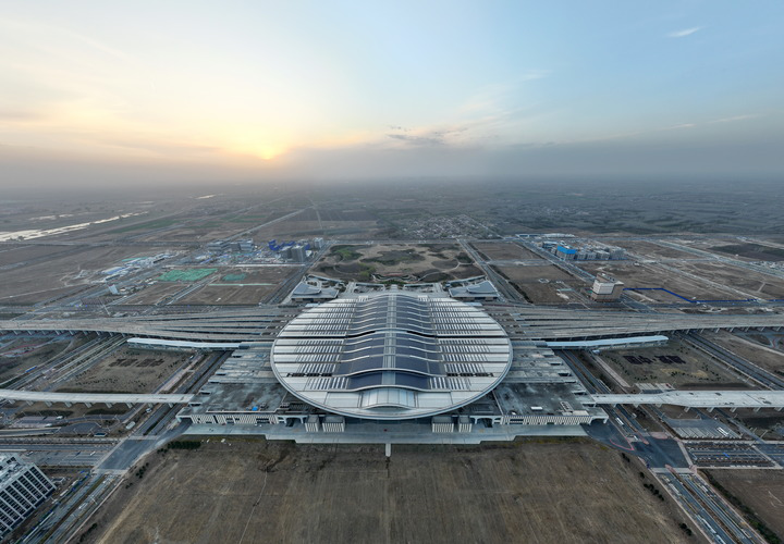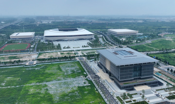 雄安新区启动区的雄安体育中心(左上)与雄安图书馆(右下)(2025年7月16日摄)。新华社发