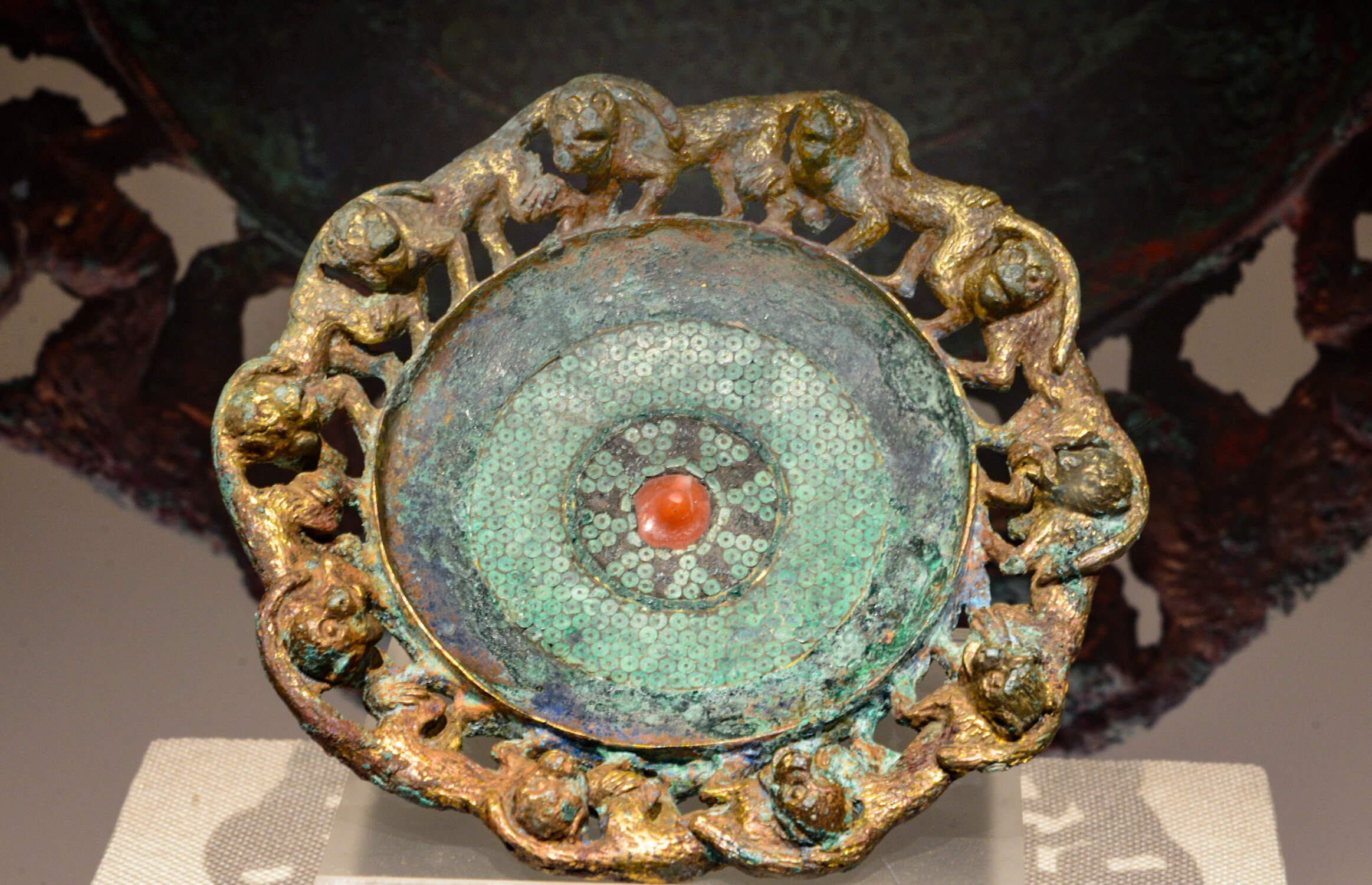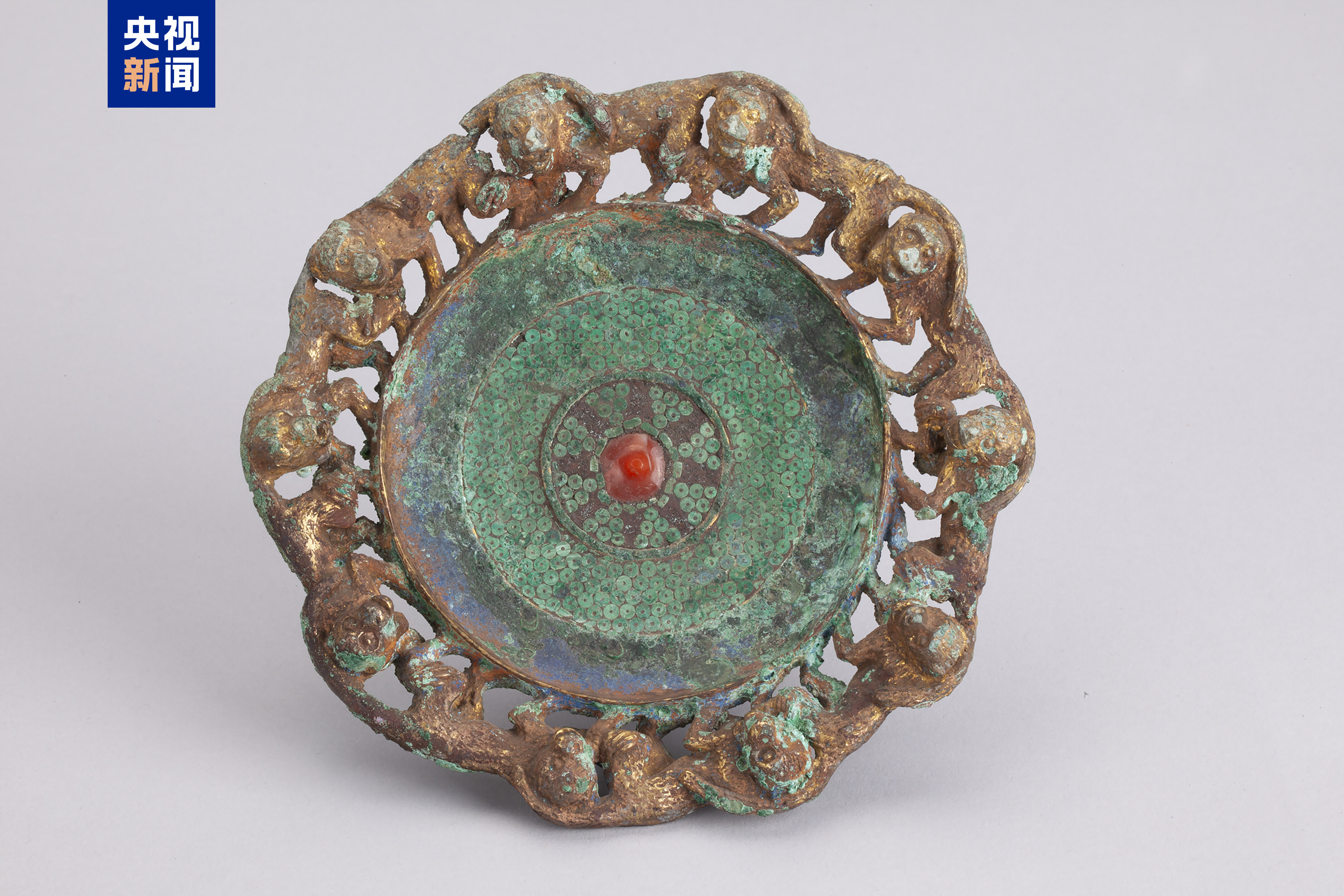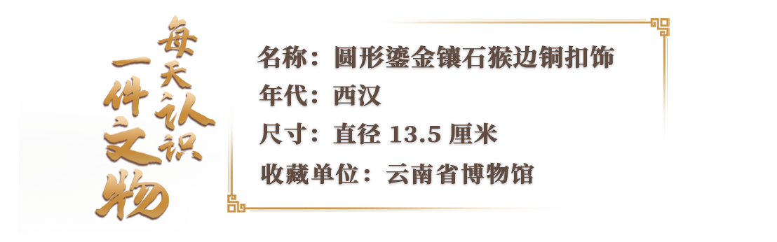 圆形鎏金镶石猴边铜扣饰