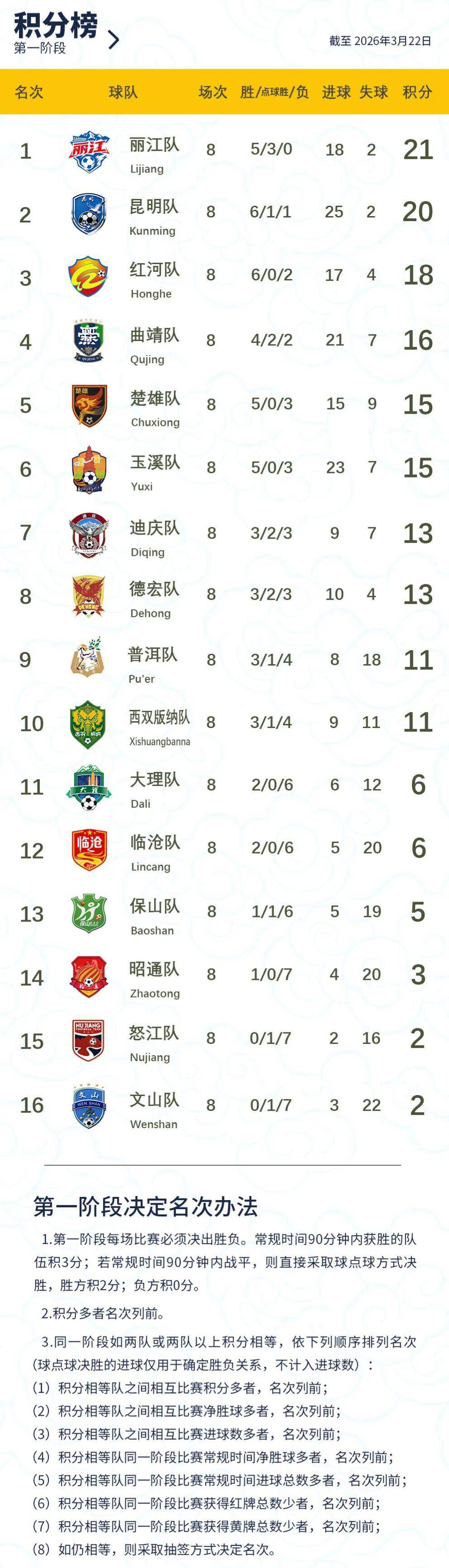 前八轮比赛战罢,联赛格局初显,各队竞争激烈。积分榜上,八轮战罢,丽江队以8战5胜3平积21分的不败战绩领跑积分榜,展现强劲实力;昆明队以6胜1平1负积20分紧随其后;红河队积18分位列第三。积分榜前列球队分差微弱,每一轮比赛的结果都可能引发排名变动,充分体现了联赛的悬念与观赏性。