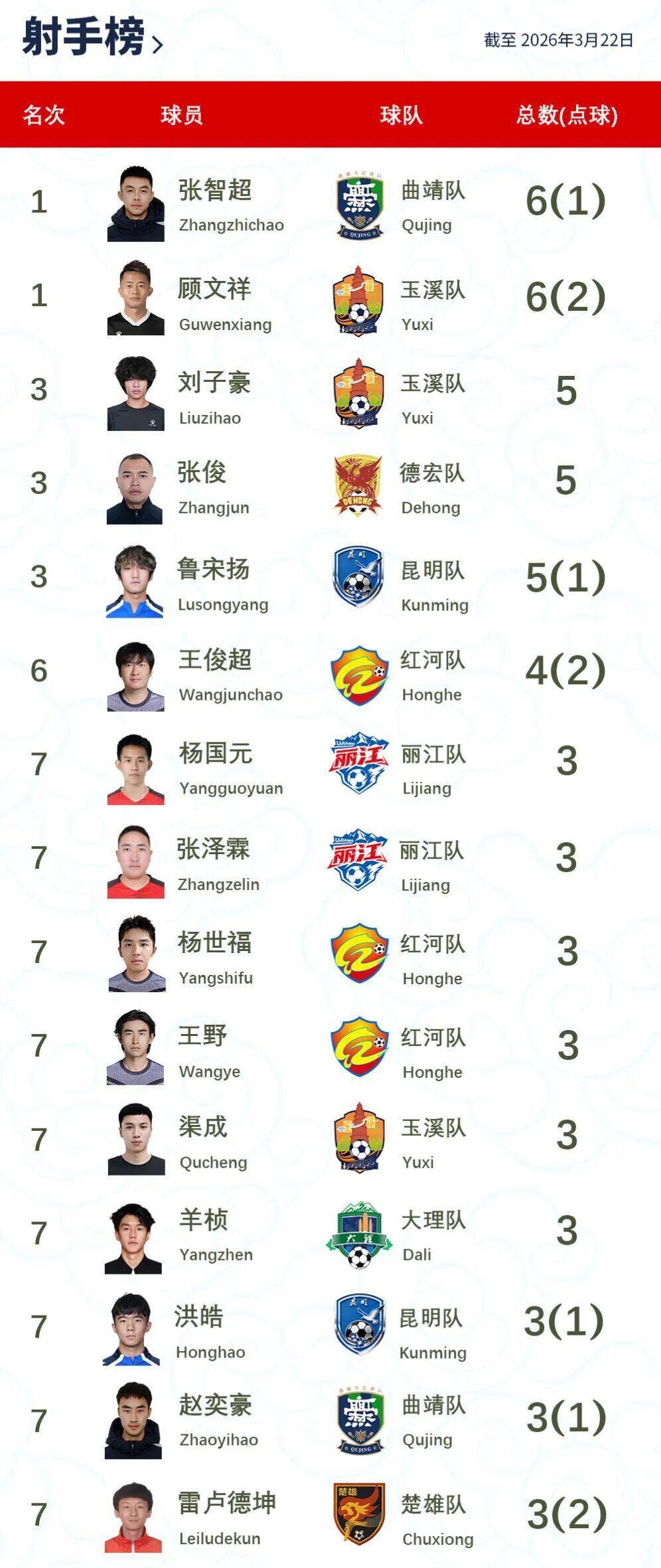 射手榜方面,竞争同样激烈。曲靖队张智超与玉溪队顾文祥同以6粒进球并列榜首;玉溪队刘子豪、德宏队张俊、昆明队鲁宋扬均打入5球,紧随其后。红河队王俊超攻入4球,丽江队杨国元、张泽霖、红河队杨世福、王野、玉溪队渠成、大理队羊桢、昆明队洪皓、曲靖队赵奕豪、楚雄队雷卢德坤等球员均有3球入账。众多本土射手在联赛舞台上崭露头角,用进球诠释着属于云南足球的进攻火力。