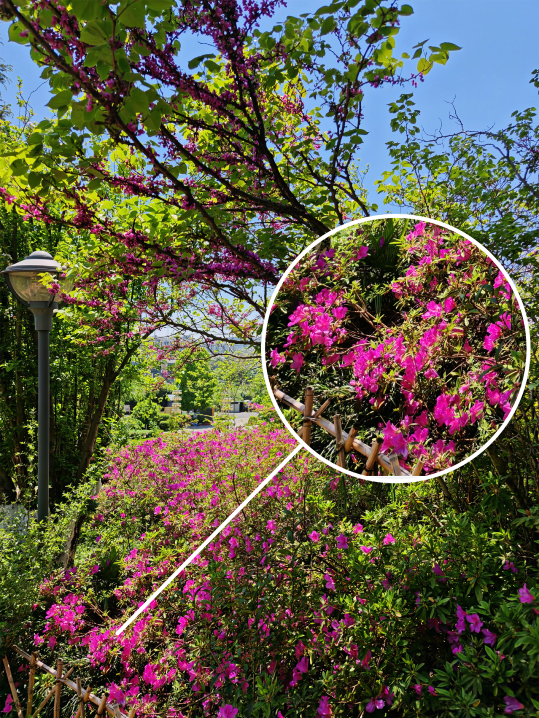 粉白、粉紫的杜鹃花一簇簇翻出枝头,像花瀑倾泻,“胭脂色”与嫩绿的草木相互映衬,格外娇艳。顺着石阶拾级而下,杜鹃花越来越多,手里的相机手机“咔咔”停不下来。