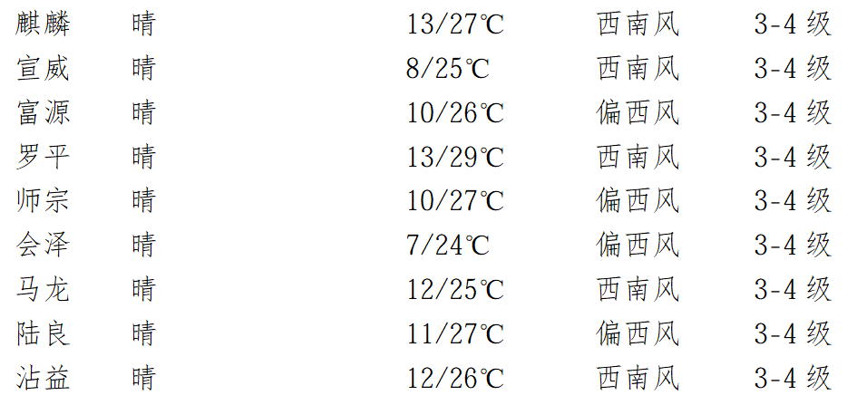 宣威局部、马龙中部森林火险气象等级2级(高),会泽南部、宣威大部、马龙大部、沾益、麒麟(含经开区)、陆良、师宗森林火险气象等级3级(较高),宣威东部、罗平、富源森林火险气象等级4级(较低)。