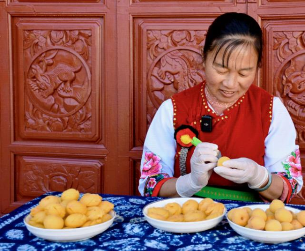 洱源雕梅是白族姑娘心灵手巧的象征,更承载着地域饮食文化的深厚底蕴。“我从小跟着奶奶学雕梅,村里600余名妇女也个个会雕梅。”有着30多年雕梅经验的李全佑介绍,选梅要挑果大、形圆、七八成熟的青梅;雕刻时刀数不少于八刀,且刀距均匀,这样压片后的“花型”才更精致美观。