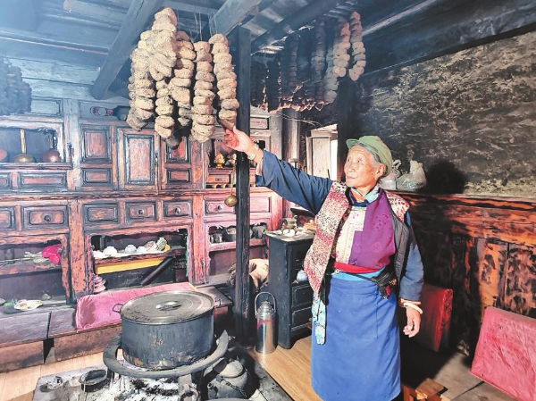 在香格里拉市洛吉乡尼汝村村民扎西拉姆家的老藏房里,挂着一串串酒曲,这是用尼汝传统工艺制作出来的酒曲。这些酒曲经过了烟熏、风干处理后,再过一段时间就将用来酿酒。