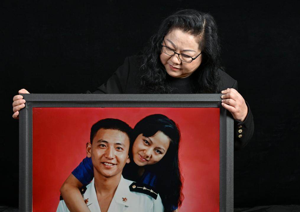 王伟的妻子阮国琴环抱着与丈夫的合影,这张照片是王伟军校毕业分配后首次探亲时拍摄的。