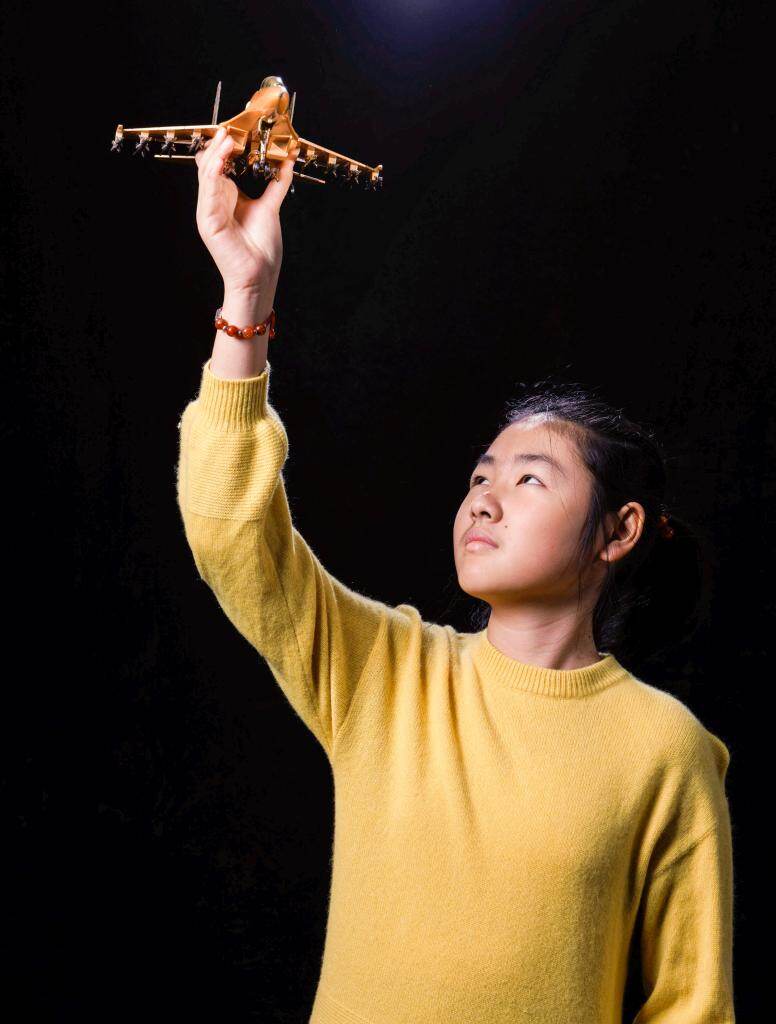 张超的女儿张上明珠手举父亲送给她的战机模型。
