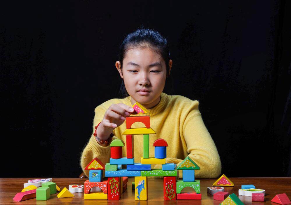 张超的女儿张上明珠在摆放父亲送给她的积木。由于张超牺牲时她刚两岁,她对父亲的记忆已经很模糊了,她的妈妈说父亲常在休息时和她搭积木、为她读童话书。