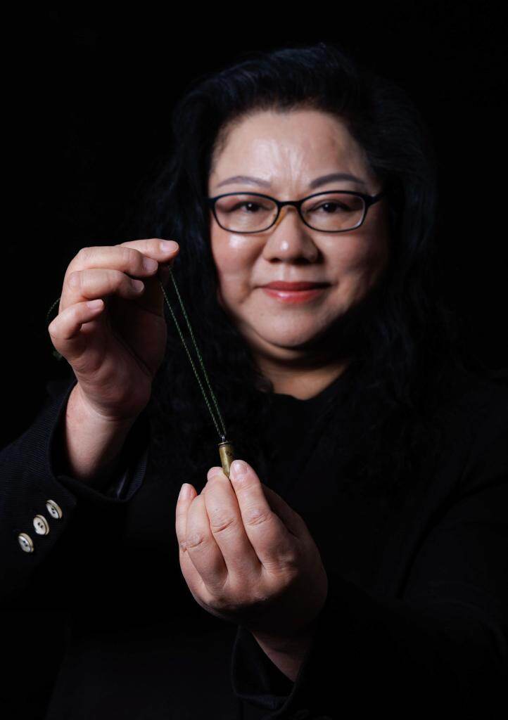 王伟的妻子阮国琴拿着丈夫送她的子弹壳项链,这是婚前王伟为她亲手制作的。