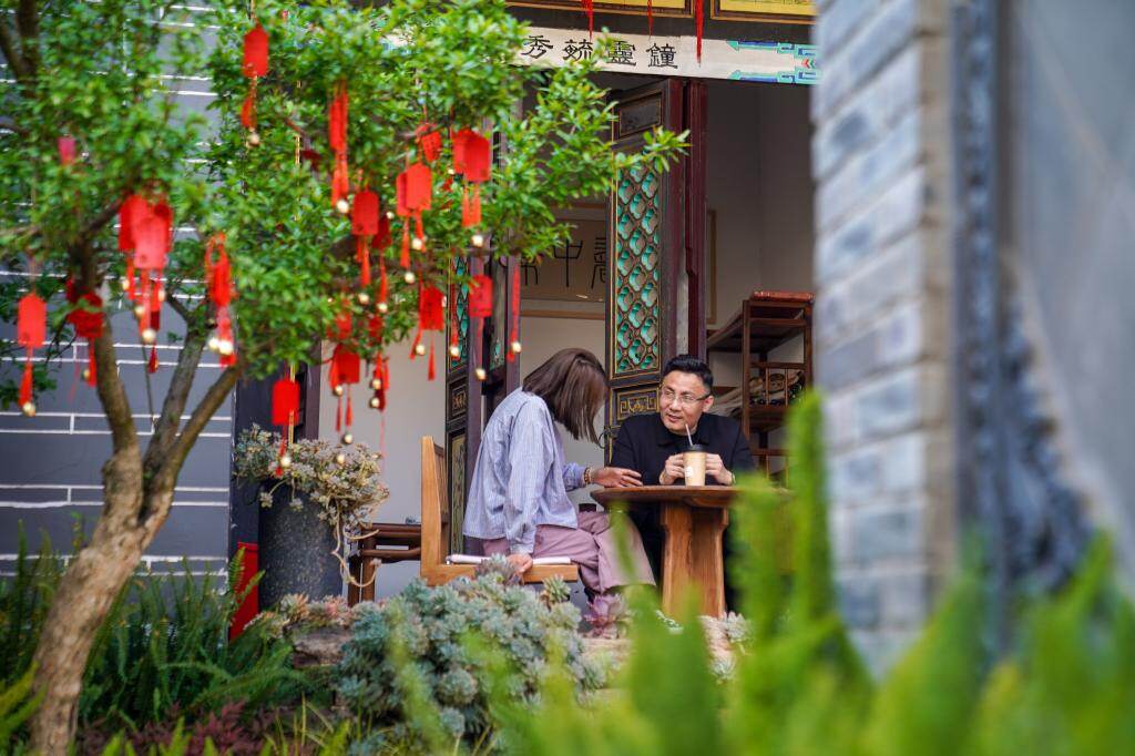 2026年3月24日,游客在白雾村读白书院(由楚黔会馆改造)喝咖啡。