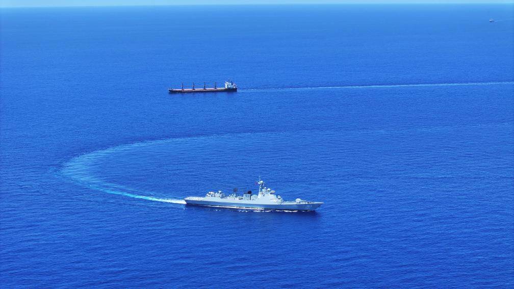 中国海军第46批护航编队焦作舰(下)护送货船至解护点后与之分航(2024年5月7日摄)。新华社发(张大禹 摄)