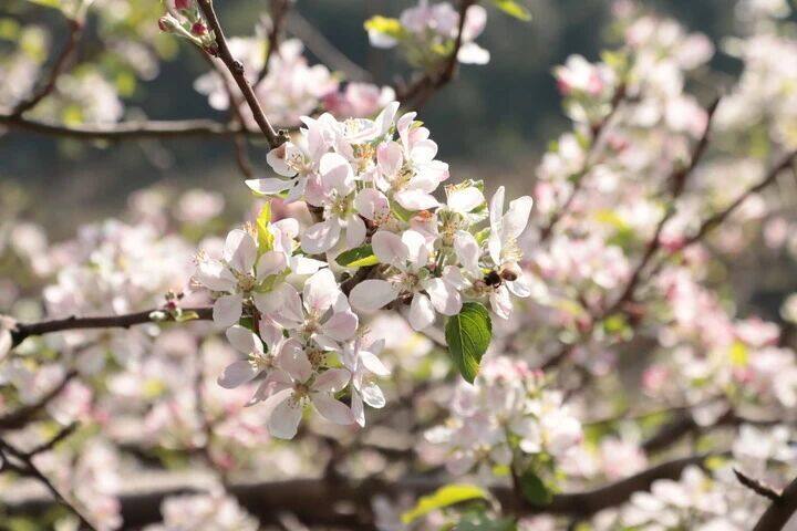 沿山间公路蜿蜒而上,车窗外灰褐的石山夹杂着灌木与湿地松,视野渐渐被一团团、一片片粉白的轻纱覆盖——那是正值盛花期的山地苹果园。路边还不时出现几株桃花、梨花。