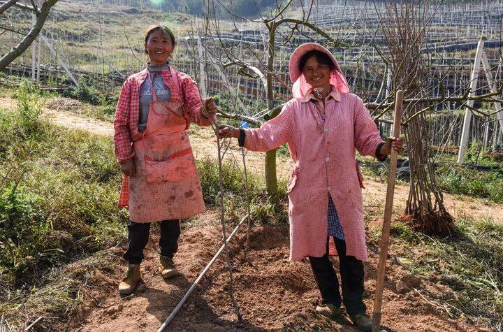 西北勒乡的农户在果园里种植苹果树苗。新华社记者熊轩昂摄