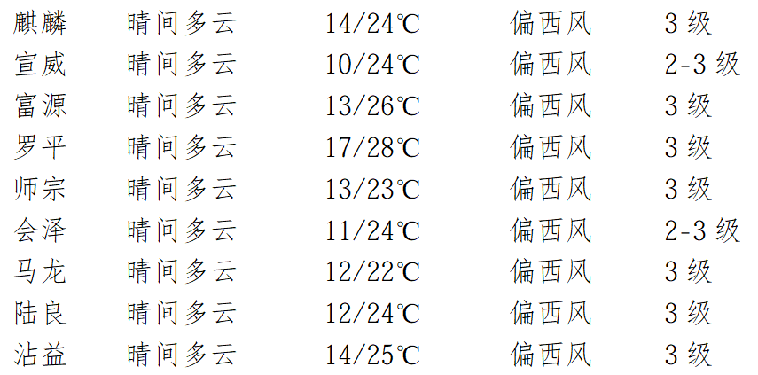 会泽北部、宣威北部森林火险气象等级3级(较高),会泽南部、宣威中部及南部、沾益、马龙、陆良、麒麟、富源、罗平、师宗森林火险气象等级2级(高)。