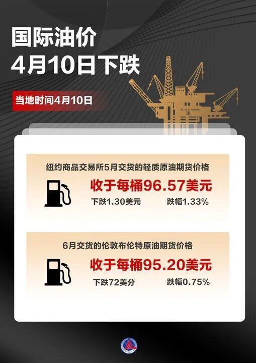 截至当天收盘,纽约商品交易所5月交货的轻质原油期货价格下跌1.30美元,收于每桶96.57美元,跌幅为1.33%;6月交货的伦敦布伦特原油期货价格下跌72美分,收于每桶95.20美元,跌幅为0.75%。