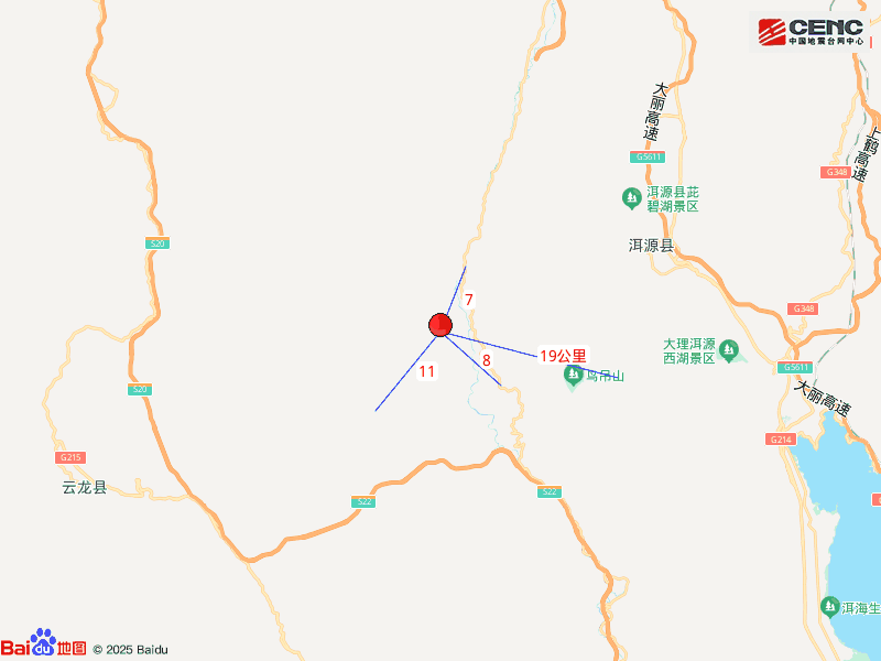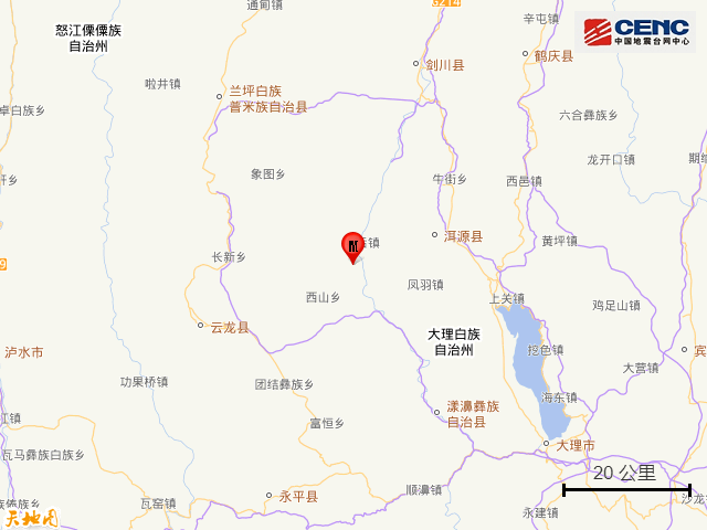 周边县城:震中距洱源县23公里、距云龙县42公里、距漾濞彝族自治县46公里、距兰坪白族普米族自治县57公里、距剑川县57公里,距大理白族自治州71公里,距昆明市317公里。