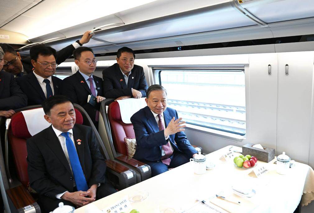 4月16日,越共中央总书记、国家主席苏林乘高铁离开北京,启程前往广西,继续在中国的访问行程。新华社记者 戴天放 摄