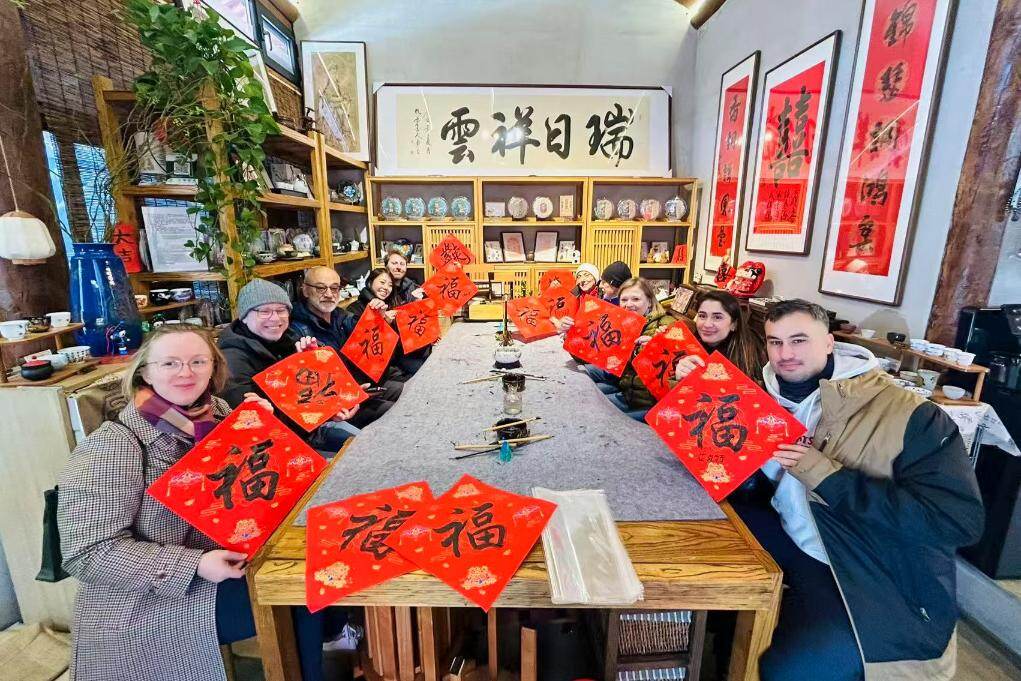 2025年12月,外国游客在北京大栅栏街区体验中国书法。新华社记者 周心怡 摄