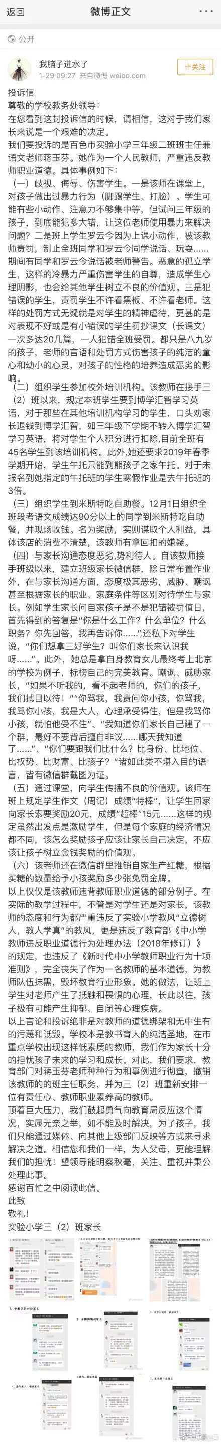 1月28日,有家长在网上发帖称:广西百色市实验小学蒋玉芬教师歧视在殡仪馆工作的家长、孤立她的孩子,并有体罚学生、私下向家长兜售商品并与处罚学生挂钩等行为。1月29日,百色市右江区教育局通报称,涉事教师已被停职。